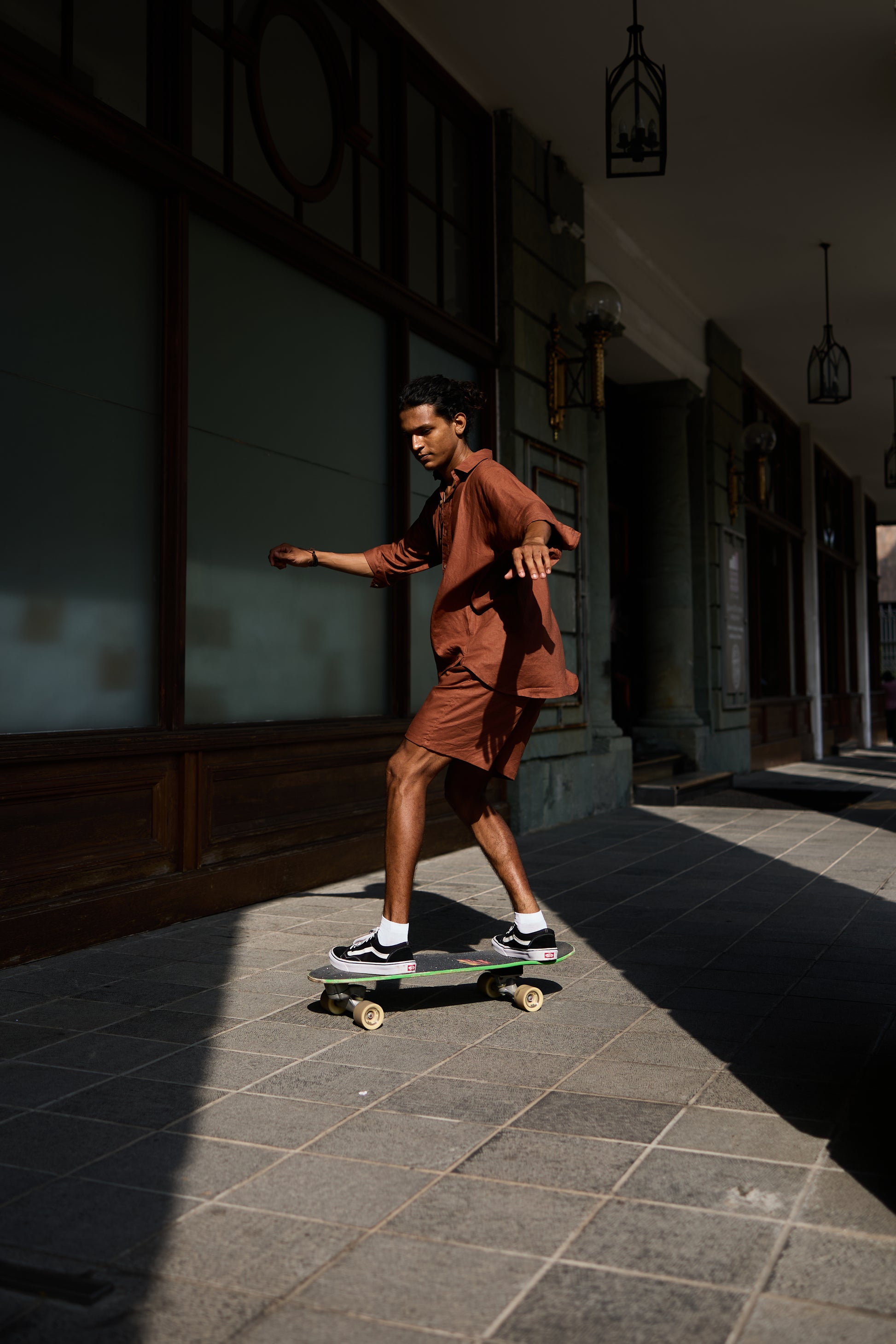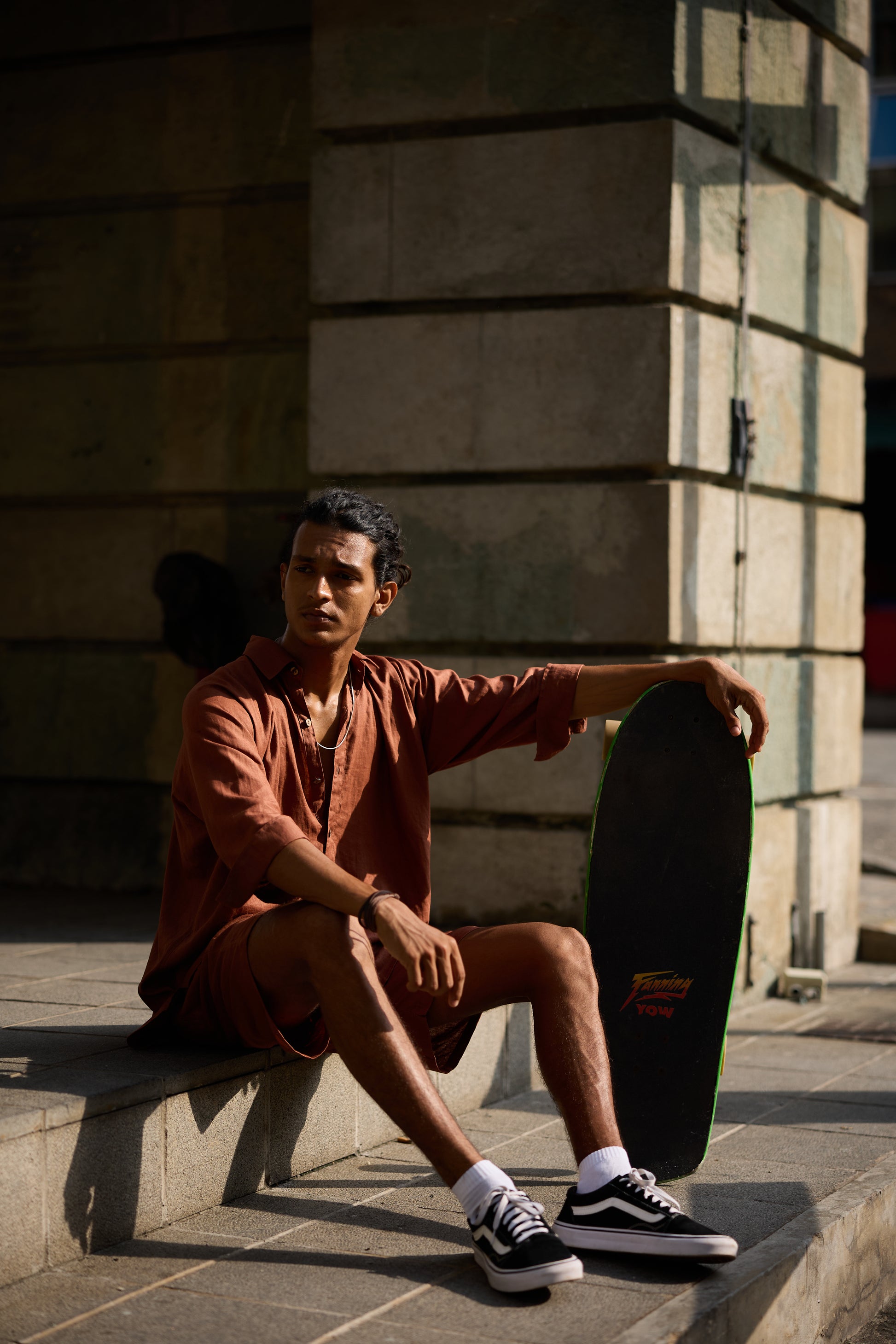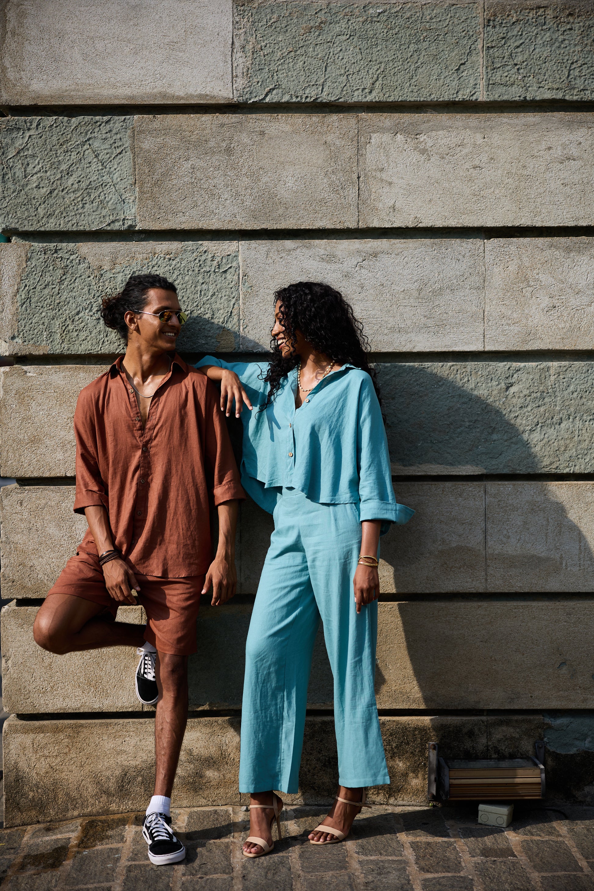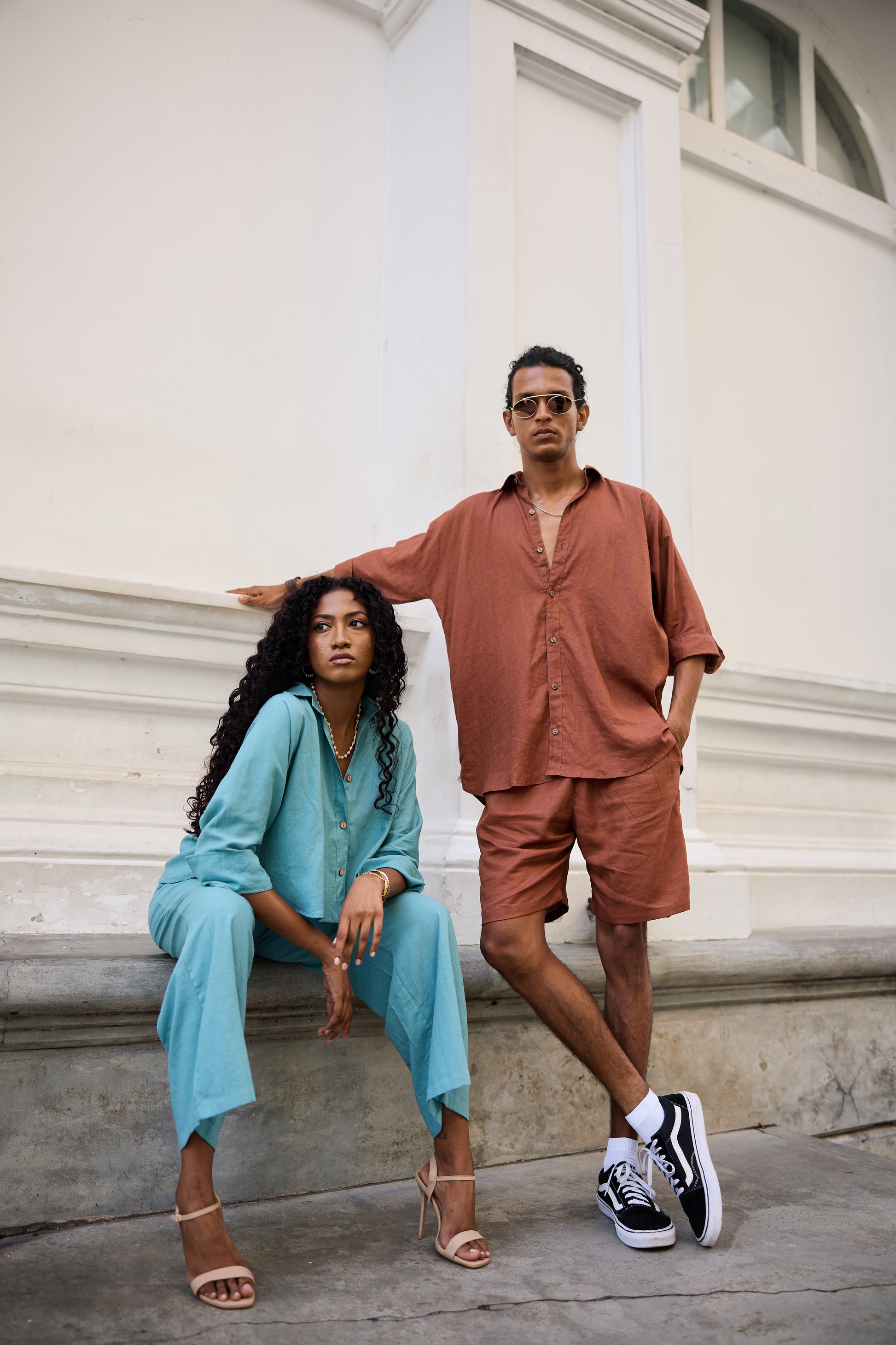 Caramel linen co-ord set combine comfort, style, and elegance, made from breathable, skin-soft natural linen. Wide shirt and linen shorts with four pockets, two front and two back. Elastic waistband, set available in M, L and XL.