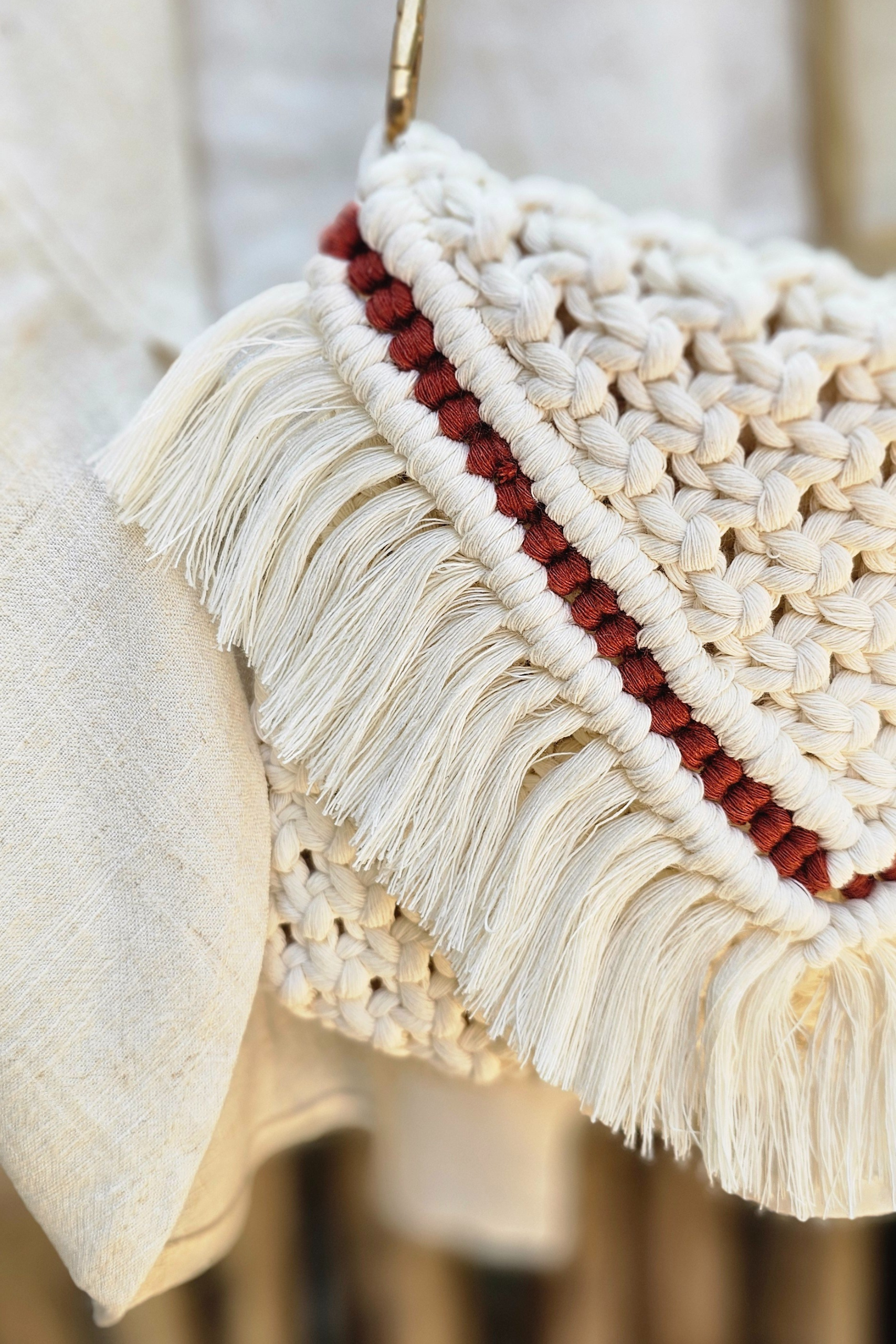 Introducing the Hiriketiya Bag, a 100% cotton macrame handmade bag in a light beige color with a unique terracotta bindweed design. Perfect for adding a touch of bohemian chic to any outfit. Carry all your essentials in style with this quirky and playful bag.