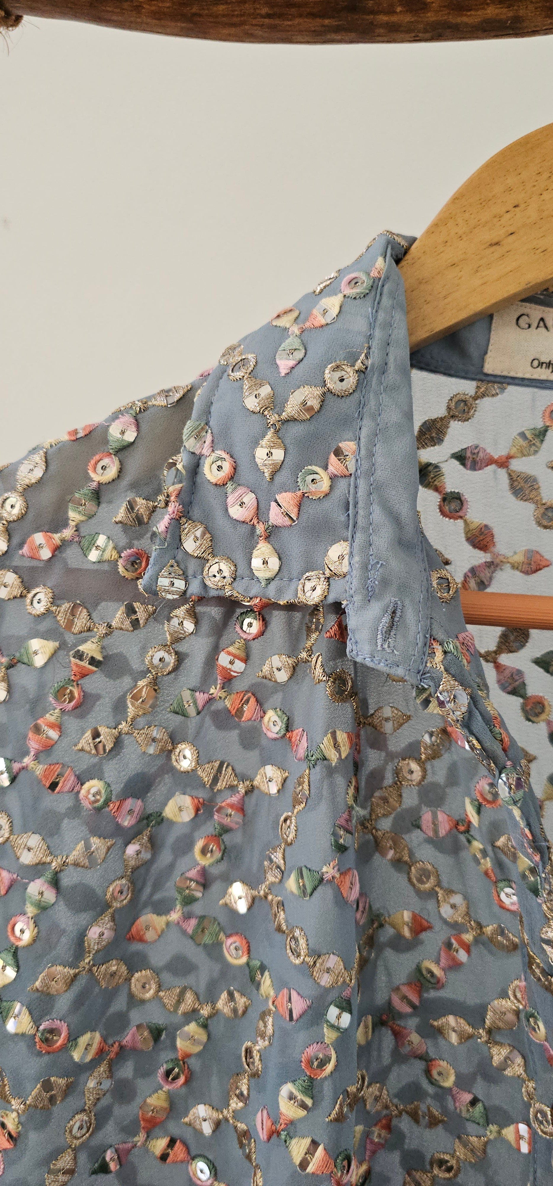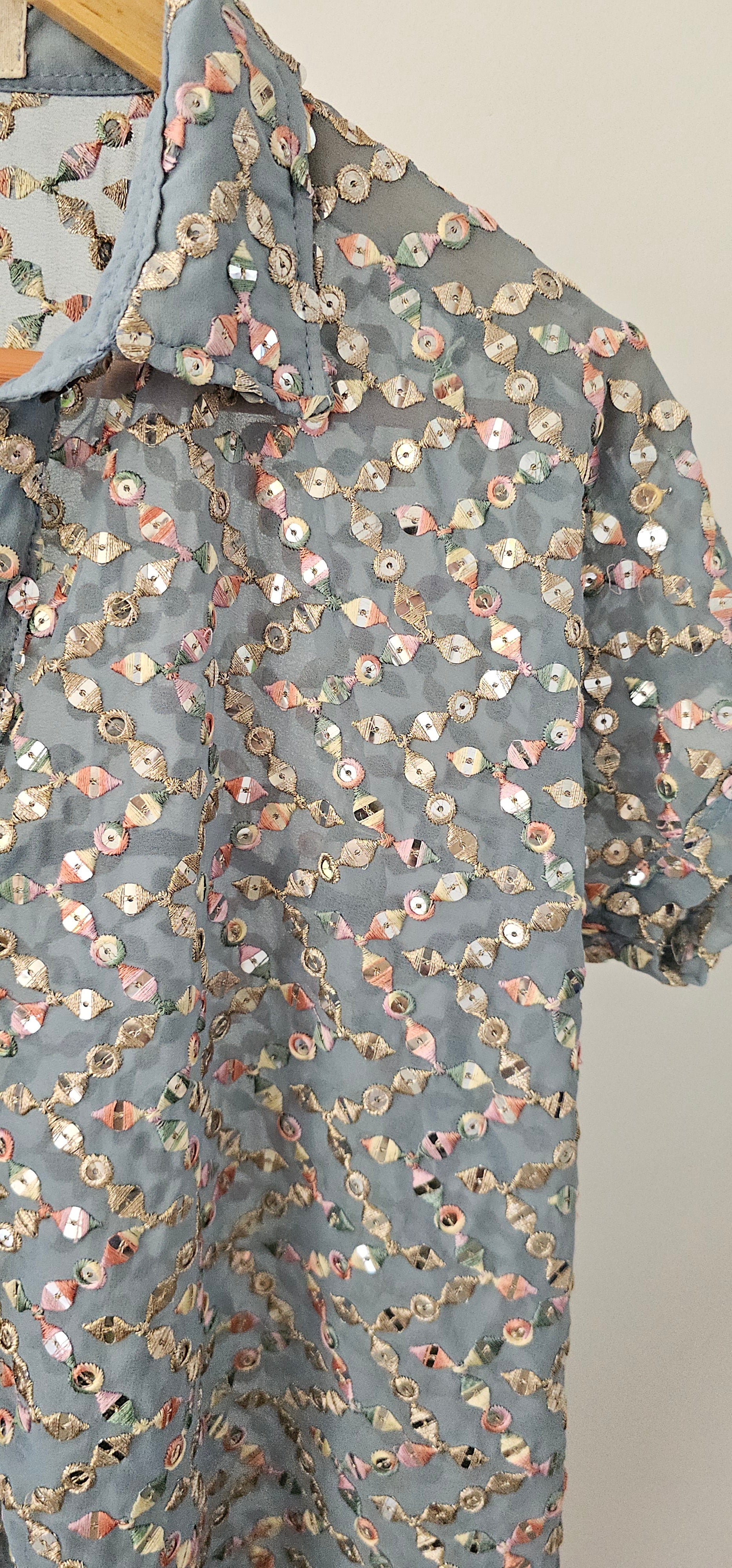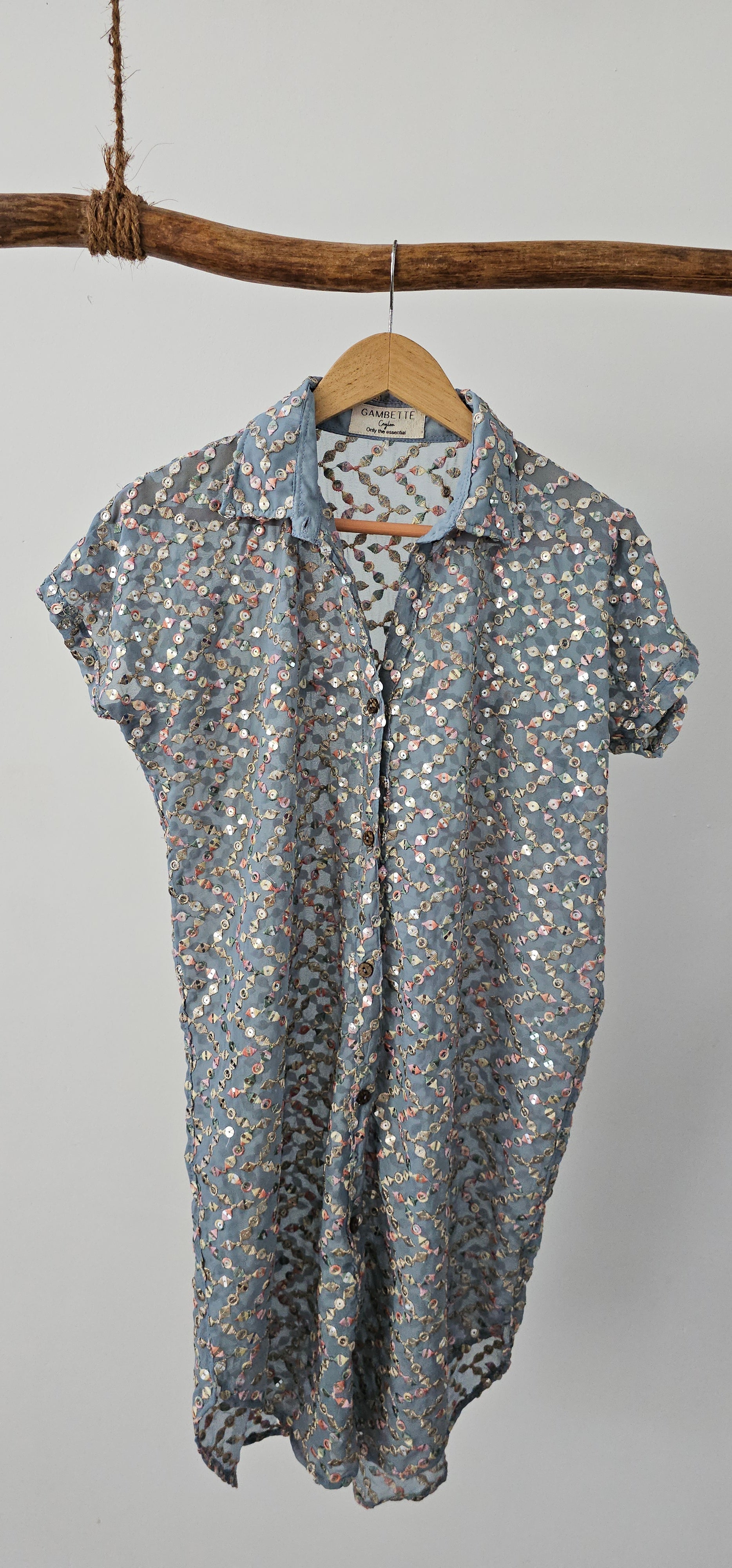Lyana is sewn in a single edition. The designer demonstrates his love of noble fabrics by creating a unique, flowing shirt for day or evening wear. It's cut loosely to allow freedom of movement. Embroidered chiffon shirt with coconut wood buttons.