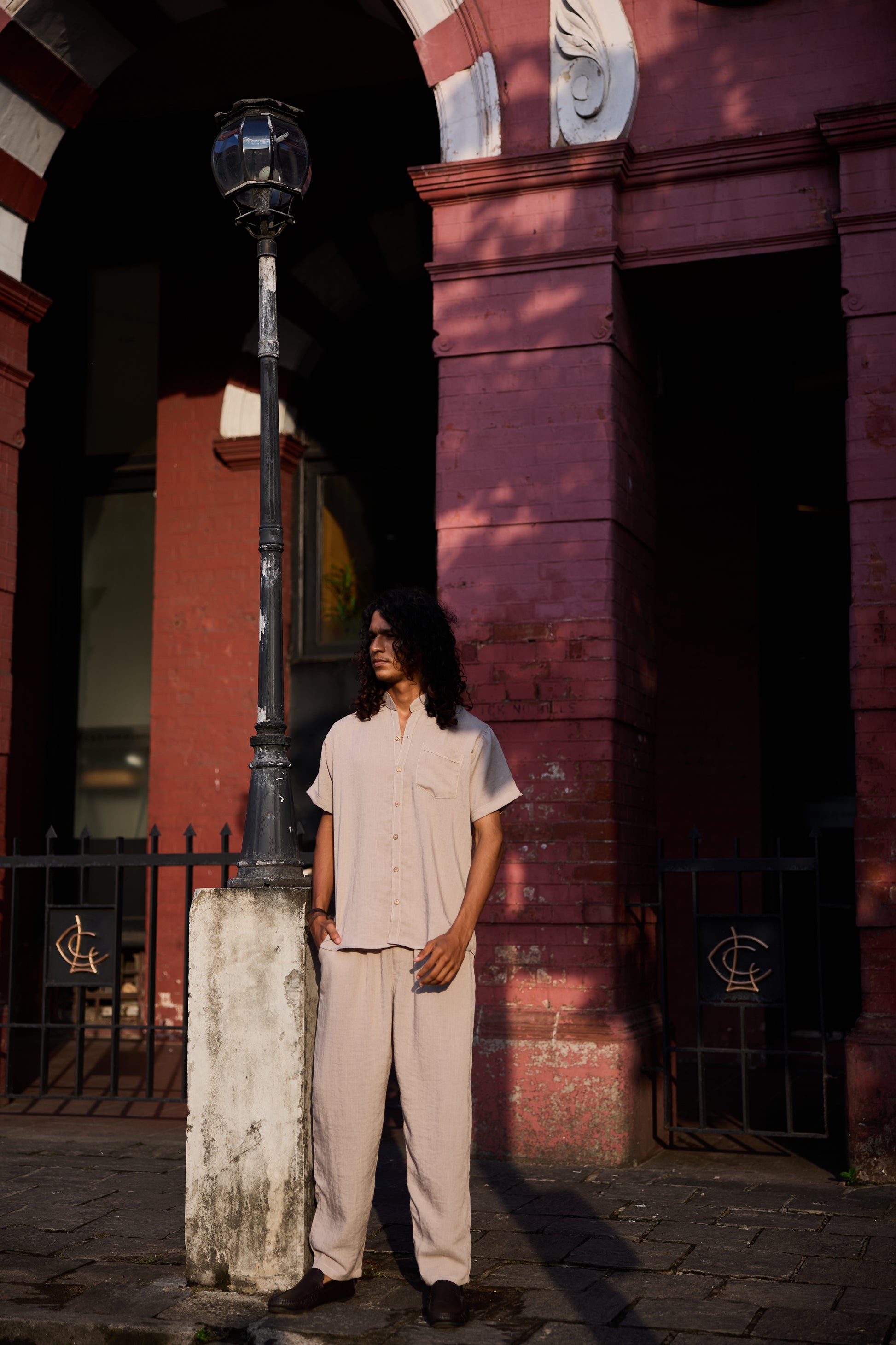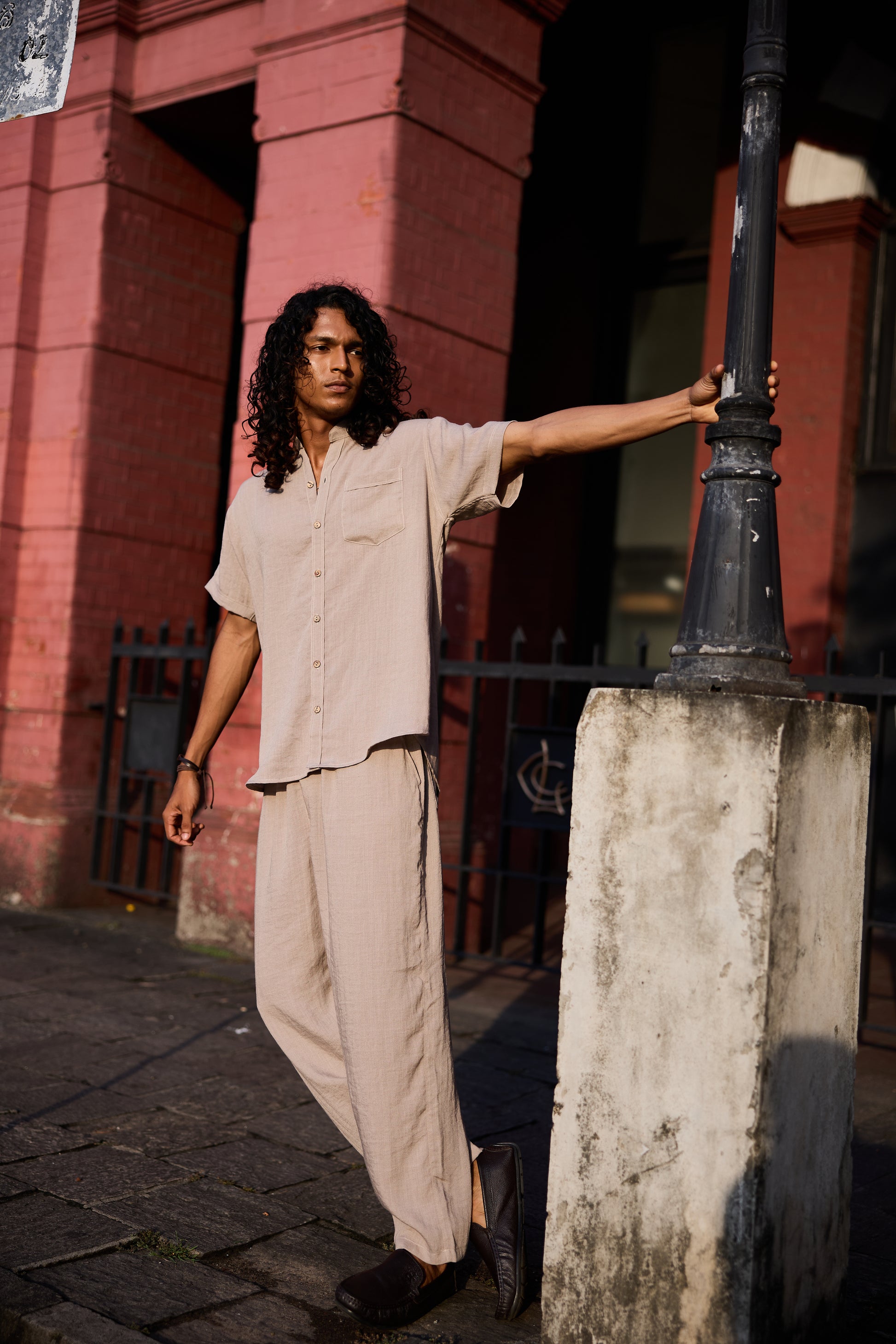 Indulge in luxury with our Stone Set, a linen coordination for men. The breathable material and natural stone color provide effortless style. The original color flows throughout the wide-cut pants and short-sleeved axel shirt. Elevate your wardrobe with this exclusive set.