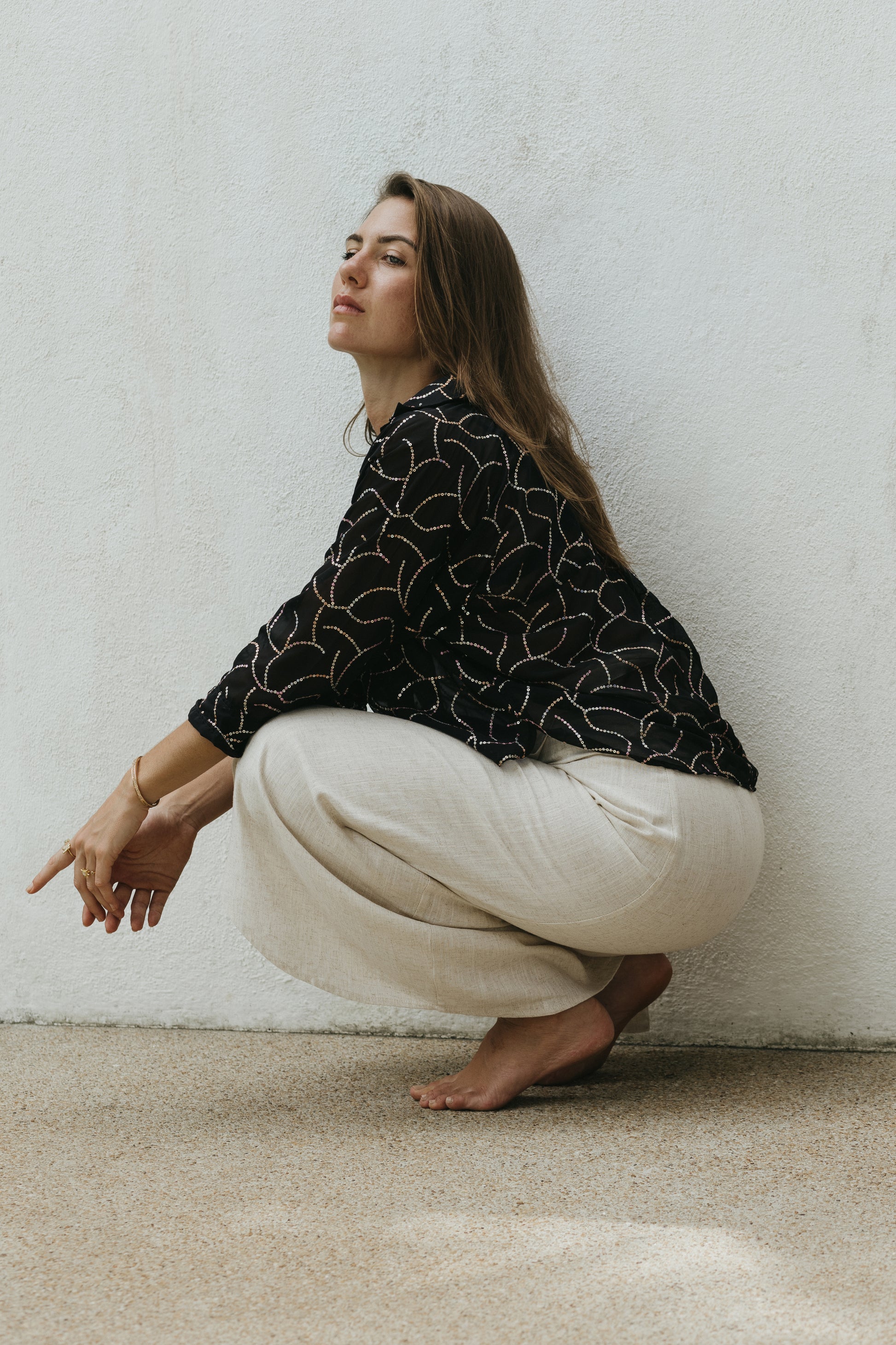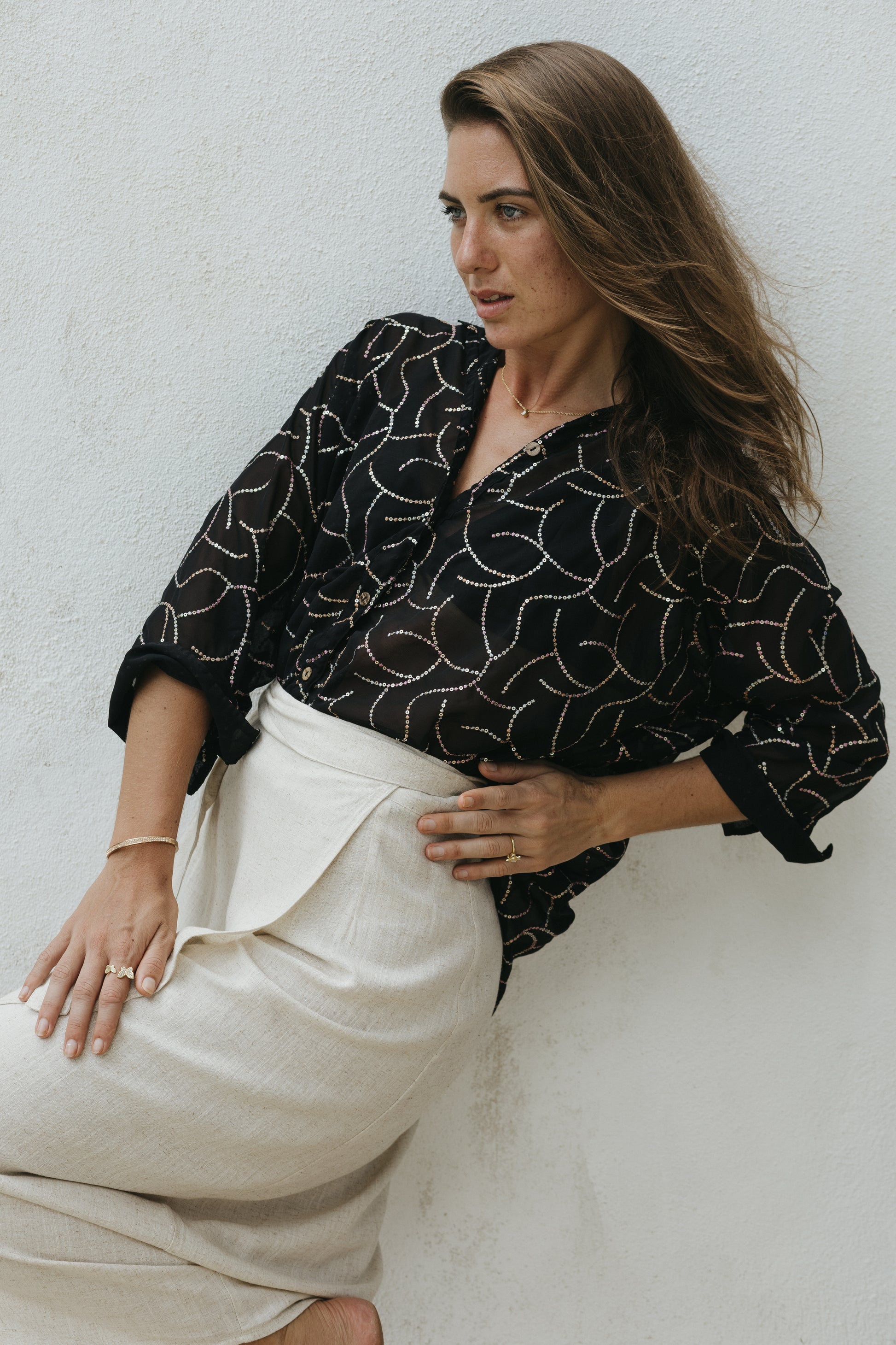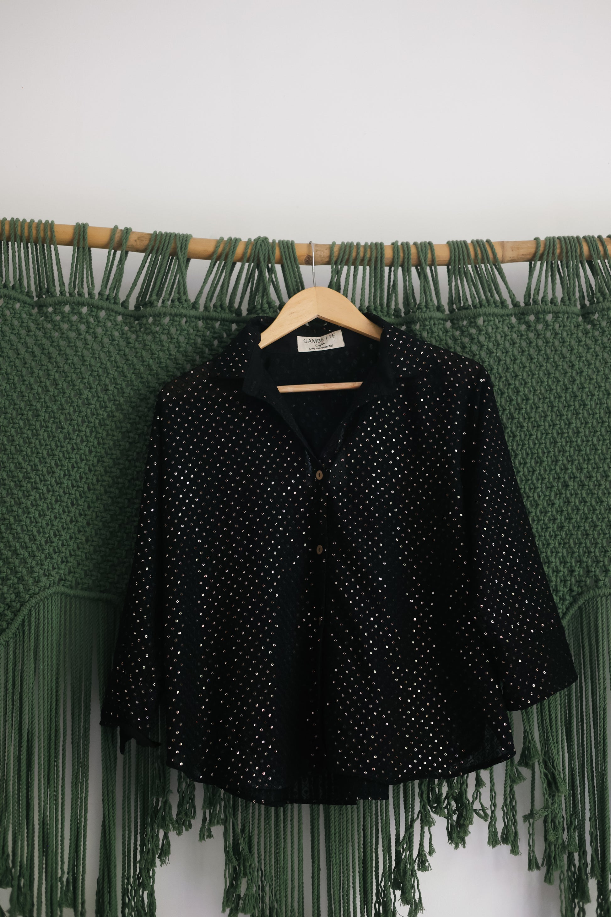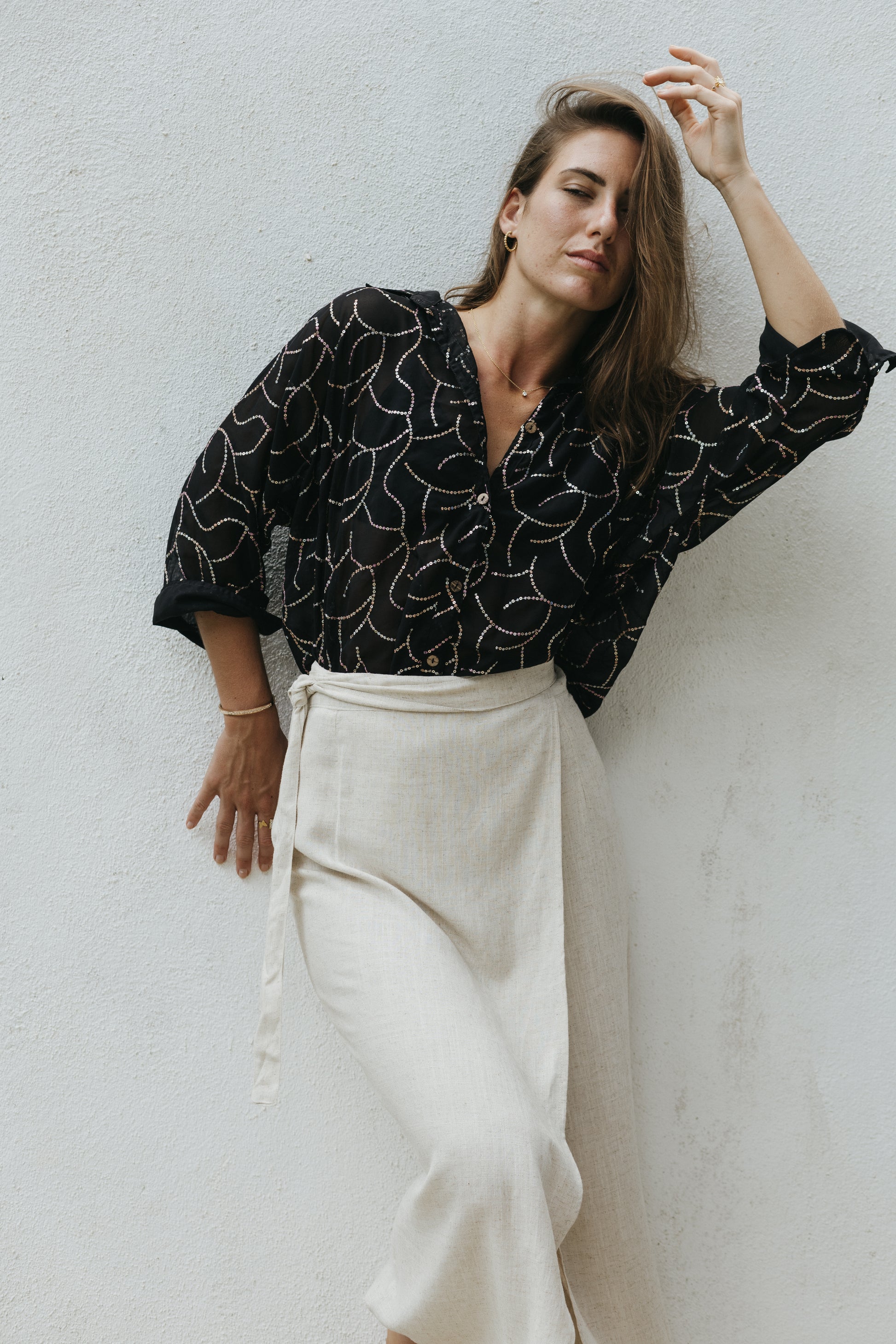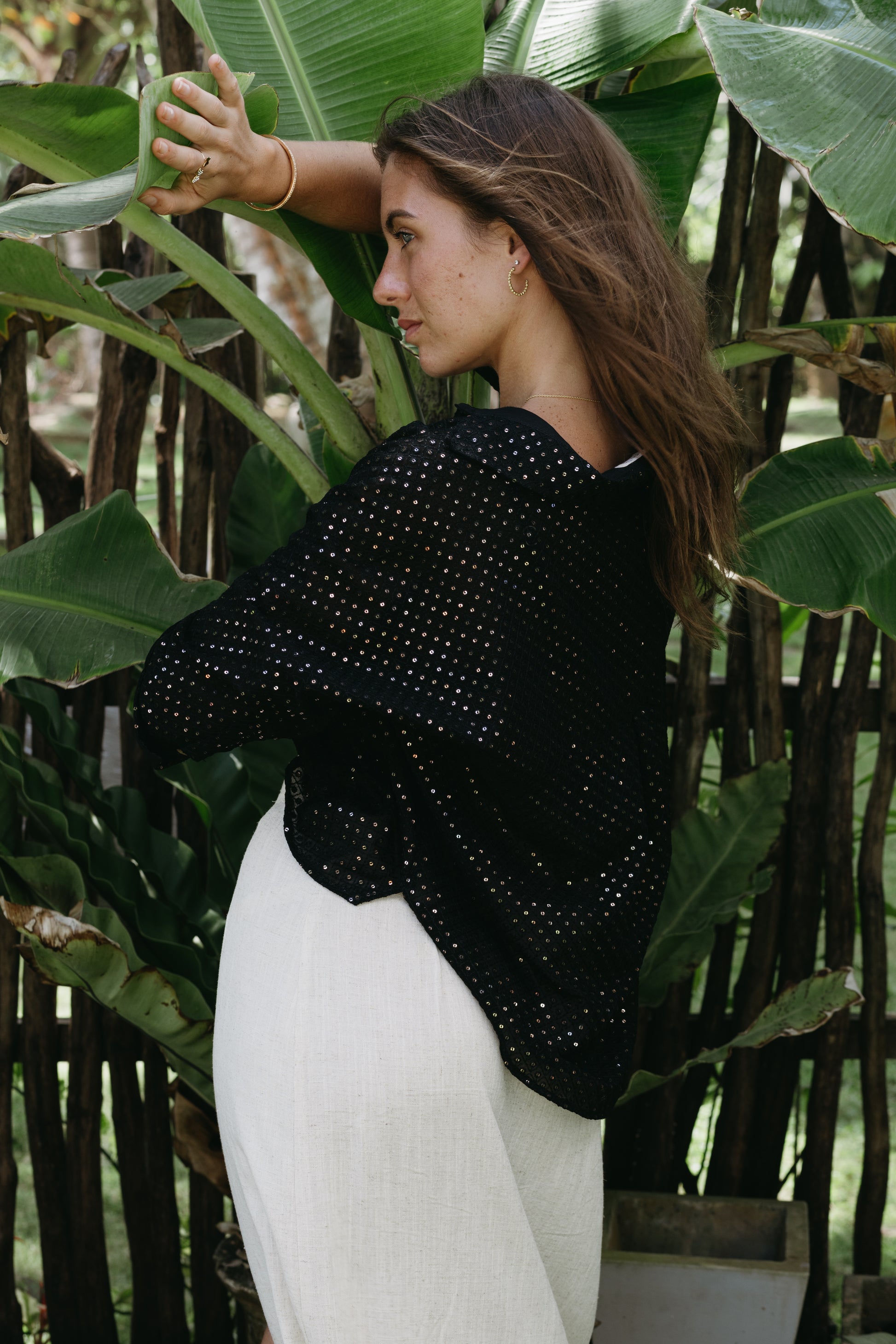 The Suhasna Black Edition shirt plays with style through its unique mid-length cut, designed to be tied above the waist and effortlessly highlight your silhouette. Made from a lightweight, slightly see-through fabric that catches the light just right, it adds a touch of fun sophistication. With flirty 3/4 sleeves and charming coconut buttons, this piece is your go-to for playful days and stylish nights.